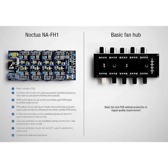 高品質でスマートな保護機能付き8チャネルPWMファンハブのNA-FH1は、、最大8つのPWMファンを1つのPWMマザーボードファンヘッダーまたはオプションのNA-FC1などのスタンドアロンコントローラで同時に実行・制御できます。非PWMファンは、入力電圧を調整することによって制御できます。NA-FH1は、4ピンPWMおよび3ピンコネクタを備えた12Vと5Vファンの両方をサポートし、PC環境やその他の12Vまたは5Vベースの環境に最適です。S-ATA入力(12Vファンの場合は最大54W)または4ピンPWM入力(5Vまたは12Vファンの場合は最大24W)を介して給電できます。どちらも、接続されたデバイスやケーブルでショートが発生した場合、自己リセットヒューズによって過電流から保護されます。2つのポートをデバイスと同時に使用して、S-ATA経由で自動的に給電し、4ピンインターフェイス経由でRPM信号とPWM信号を交換することもできます。モニタリングのしやすいホワイトのステータスLED付きです。また、NA-FH1を簡単にPCケース内やその他スチール製の表面に取り付けられます。NA-FH1はCE、UKCA、UL認証など該当するすべての安全基準に準拠し、安心して使用可能なNoctuaメーカーからの6年間が付いています。最大8台のファンの電源供給と制御が可能な、安全で信頼性の高いプレミアムのチョイスです。ご注意:ハードディスクドライブに直接置かないで、5cm以上の距離を保ちます。PCマザーボードから4ピン入力で電源を供給する場合は、マザーボードのマニュアルでファンヘッダーの最大電流を確認の上、超えない範囲でお使い下さい。S-ATA入力は12Vファンでのみ使用できます。 5Vファンと同時にS-ATA入力をしないようご注意ください!