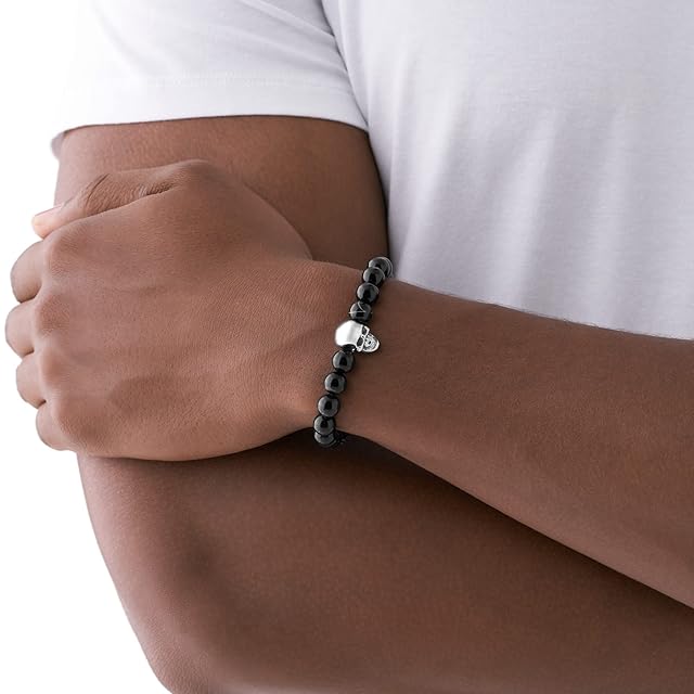 Dieselのビーズブレスレットは、ブラックメノウ、ステンレススチール、スライダークロージャーが特徴です。