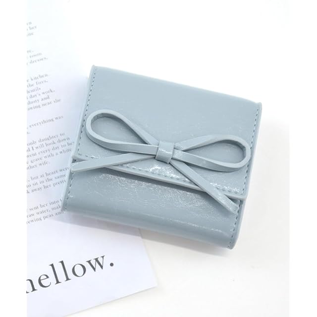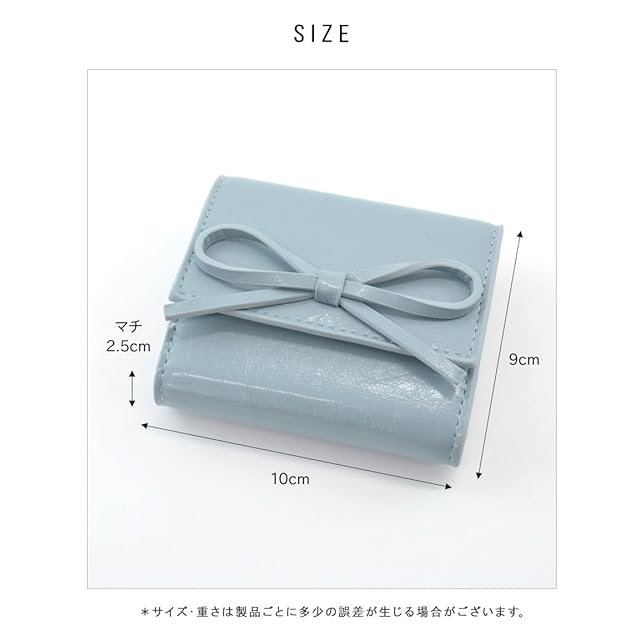 【サイズ】横幅:10cm 高さ:9cm マチ:2.5cm <br><br>【素材】合成皮革<br>【仕様】開閉:スナップボタン内側:小銭入れ(ボックスコイン)×1、カードポケット×7、札入れ×1<br>【重さ】約86g<br>・リボンがトレンドライクな三つ折り財布。<br>・細めの大きいリボンがポイント!<br>・内側の小銭入れは、見やすく取り出しやすいボックス型。<br>・縦からも横からも出し入れできる札入れで、支払いもスマート。<br>・内側のカードポケットは7つあり、見た目以上の収納力もポイント。<br>・片手に収まるちょうどイイサイズ感で、小さめのバッグにもぴったり。