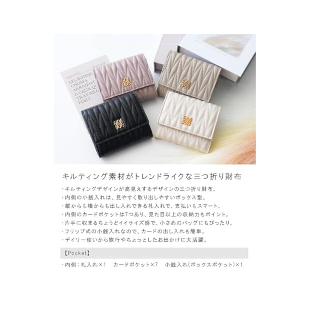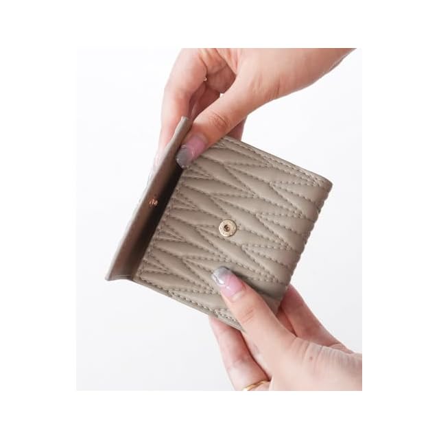【サイズ】:横幅:9cm 高さ:10cm マチ:2.5cm 重さ 約88g<br> 【素材】:合成皮革<br> 【仕様】:開閉:スナップボタン<br> 【内側】:札入れ×1 カードポケット×7 小銭入れ(ボックスポケット)×1<br> <br> ・キルティングデザインが高見えするデザインの三つ折り財布。<br> ・内側の小銭入れは、見やすく取り出しやすいボックス型。<br> ・縦からも横からも出し入れできる札入れで、支払いもスマート。<br> ・内側のカードポケットは7つあり、見た目以上の収納力もポイント。<br> ・片手に収まるちょうどイイサイズ感で、小さめのバッグにもぴったり。<br> ・フリップ式の小銭入れなので、カードの出し入れも簡単。<br> ・デイリー使いから旅行やちょっとしたお出かけに大活躍。<br>【ご注意】<br> ・お客様のモニター環境や、お部屋の照明・日当たり具合などにより、実際のお色味と異なる場合がございます。<br> ・サイズ・重さは、平置き・メジャー採寸のため、商品ごとに多少の誤差が生じる場合がございます。<br> ・プリント・型押し加工などの柄物は、裁断位置により一点一点表情の違う仕上がりになります。<br> ・生産時期により、色・サイズ・デザインが多少異なる場合がございます。<br> ・製造工程の関係上サイズ感には若干の個体差がございます。<br>アパレル、ストールなどの布製品【約-2cm~+2cm】ニット製品【約-3cm~+3cm】<br> ※無断での画像の転載などは、禁止しております。<br>
