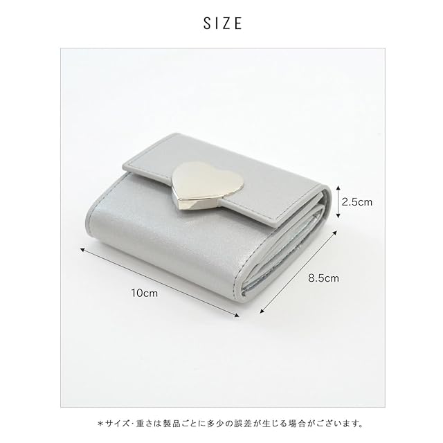 【サイズ】横幅:10cm 高さ:8.5cm マチ:2.5cm <br><br>【素材】合成皮革<br>【仕様】開閉:マグネット内側:小銭入れ(ボックスポケット)×1、カードポケット×7、札入れ×1<br>【重さ】約100g<br>・大きなハートがトレンドライクな三つ折り財布。<br>・内側の小銭入れは、見やすく取り出しやすいボックス型。<br>・縦からも横からも出し入れできる札入れで、支払いもスマート。<br>・内側のカードポケットは7つあり、見た目以上の収納力もポイント。<br>・片手に収まるちょうどイイサイズ感で、小さめのバッグにもぴったり。<br>・同じデザインのバッグやパスケースと合わせても可愛い♪