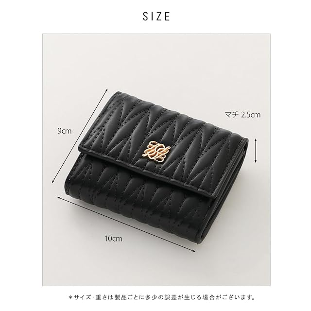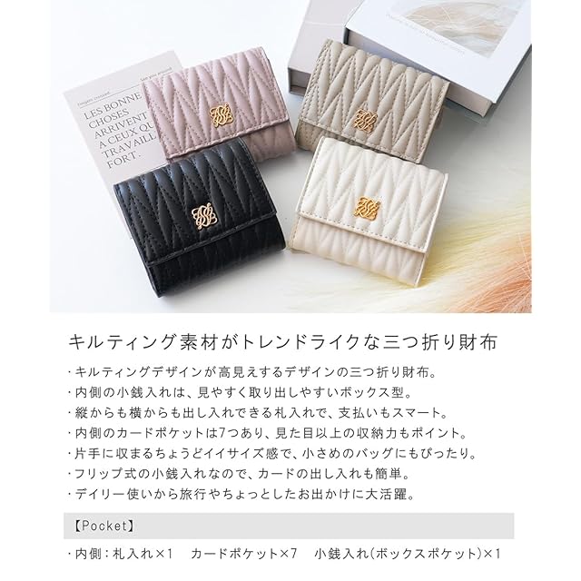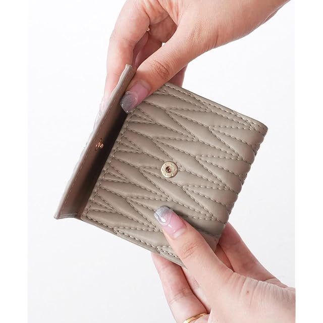 【サイズ】:横幅:9cm 高さ:10cm マチ:2.5cm 重さ 約88g<br> 【素材】:合成皮革<br> 【仕様】:開閉:スナップボタン<br> 【内側】:札入れ×1 カードポケット×7 小銭入れ(ボックスポケット)×1<br> <br> ・キルティングデザインが高見えするデザインの三つ折り財布。<br> ・内側の小銭入れは、見やすく取り出しやすいボックス型。<br> ・縦からも横からも出し入れできる札入れで、支払いもスマート。<br> ・内側のカードポケットは7つあり、見た目以上の収納力もポイント。<br> ・片手に収まるちょうどイイサイズ感で、小さめのバッグにもぴったり。<br> ・フリップ式の小銭入れなので、カードの出し入れも簡単。<br> ・デイリー使いから旅行やちょっとしたお出かけに大活躍。<br>【ご注意】<br> ・お客様のモニター環境や、お部屋の照明・日当たり具合などにより、実際のお色味と異なる場合がございます。<br> ・サイズ・重さは、平置き・メジャー採寸のため、商品ごとに多少の誤差が生じる場合がございます。<br> ・プリント・型押し加工などの柄物は、裁断位置により一点一点表情の違う仕上がりになります。<br> ・生産時期により、色・サイズ・デザインが多少異なる場合がございます。<br> ・製造工程の関係上サイズ感には若干の個体差がございます。<br>アパレル、ストールなどの布製品【約-2cm~+2cm】ニット製品【約-3cm~+3cm】<br> ※無断での画像の転載などは、禁止しております。<br>