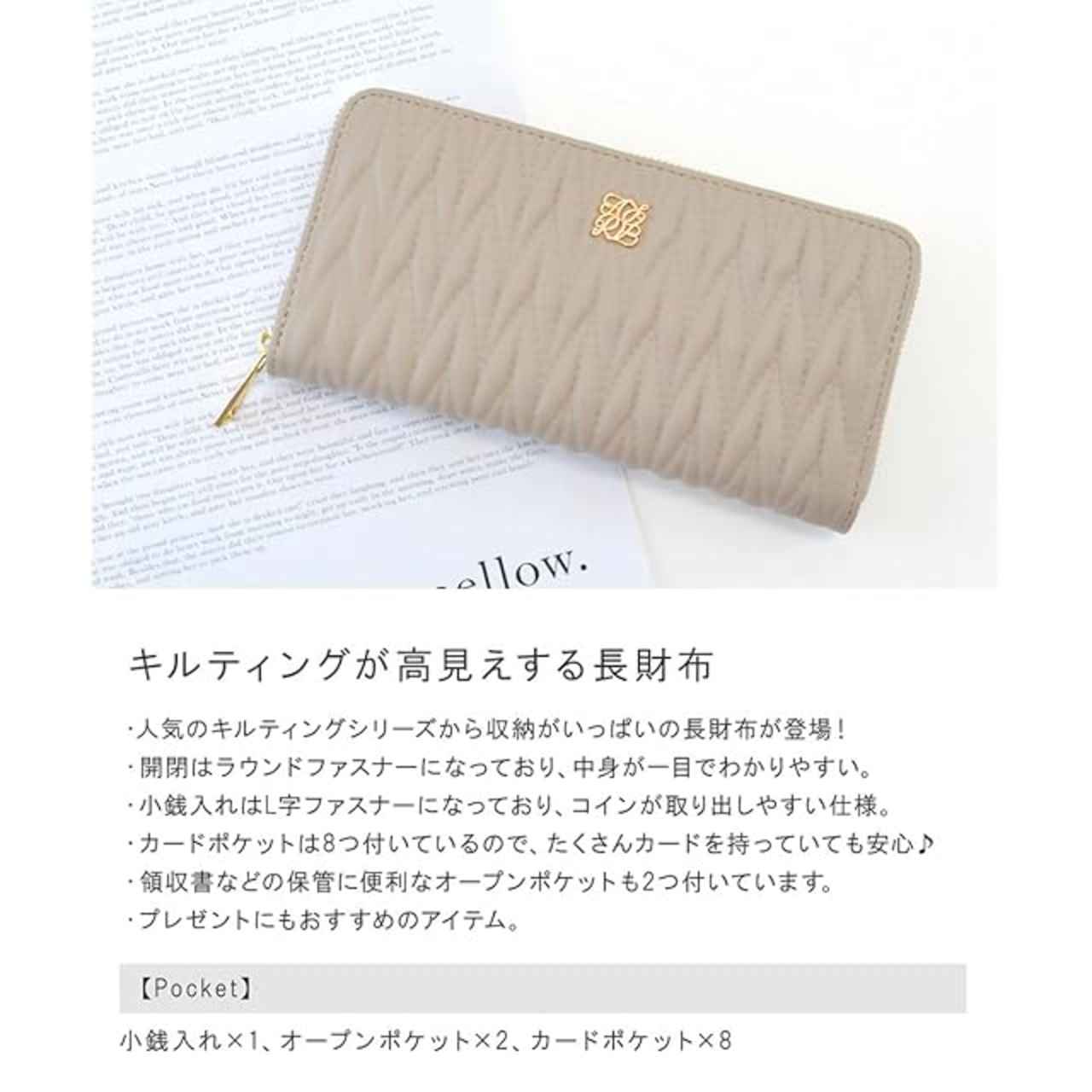 ・人気のキルティングシリーズから収納がいっぱいの長財布が登場!・開閉はラウンドファスナーになっており、中身が一目でわかりやすい。・小銭入れはL字ファスナーになっており、コインが取り出しやすい仕様。・カードポケットは8つ付いているので、たくさんカードを持っていても安心♪・領収書などの保管に便利なオープンポケットも2つ付いています。・プレゼントにもおすすめのアイテム。