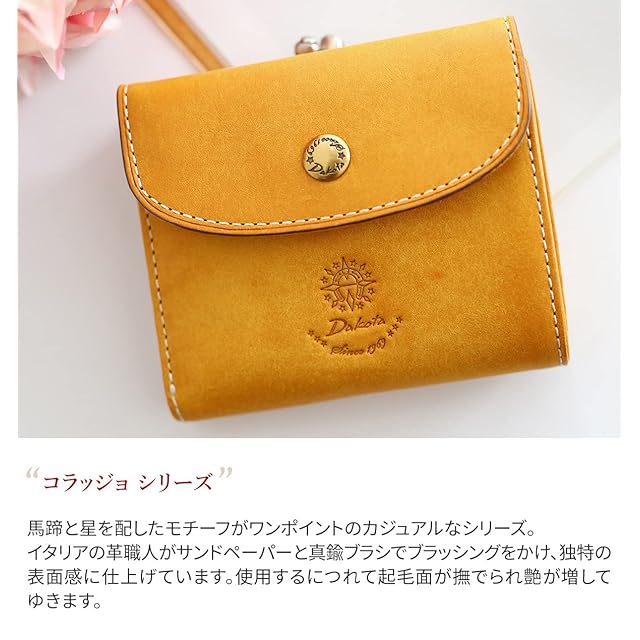 <b>ブラッシング加工を施した牛革を使用<BR> 使用するほど深みが増し、光沢感が表れます</b><BR><BR> 馬蹄と星を配したモチーフがワンポイントのカジュアルなシリーズ。イタリアの革職人がサンドペーパーと真鍮ブラシでブラッシングをかけ、独特の表面感に仕上げています。使用するにつれて起毛面が撫でられ艶が増してゆきます。<BR> 「Dakota」オリジナルロゴがアクセント。素材感を活かしたシンプルなデザインです。スナップボタンを開けるとカードやお札入れにアクセスできます。片側のカード段の後ろには更にカード入れが備わっています。お札入れは2ヶ所あるので紙幣を分けて収納可能。片方をレシート入れにして使うこともできます。小銭入れはがま口開閉で、中が見やすく硬貨をスムーズに取り出せます。コンパクトですが、収納力があるので普段使いにも最適です。<BR><BR><BR> ◆ブランド名:Dakota ダコタ<BR> ◆シリーズ:コラッジョ<BR> ◆品番:0030941 0036441<BR> ◆外寸:縦9.5cm×横11cm×まち3cm<BR> ◆重さ:150g<BR> ◆お札入れ:2ヶ所<BR> ◆小銭入れ:1ヶ所(がま口)<BR> ◆カード入れ:9ヶ所<BR> ◆内ポケット:オープン×2<BR> ◆表素材:イタリア製牛革 ◇手ざわり: 柔 □□■□□ 硬 (※表記は目安です)<BR> ◆裏地:有り<BR> ※数値は全て慨寸表記となります。
