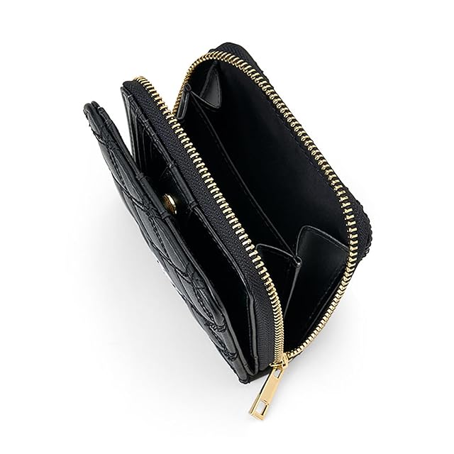 二つ折りタイプ。小銭入れ部分:ファスナー式開閉。札入れ部分:スナップボタン式開閉、札入れ1、カードポケット6、透明窓カードポケット1(透明窓部分:約幅5.3×高さ7.7cm)。