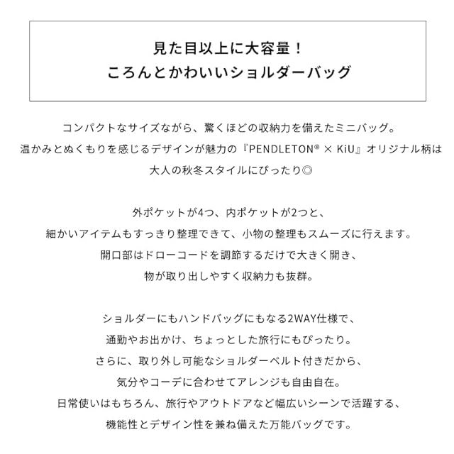 【PENDLETON × KiU Limited Item】 見た目以上に大容量!ころんとかわいいショルダーバッグ。 コンパクトなサイズながら、驚くほどの収納力を備えたミニバッグ。 温かみとぬくもりを感じるデザインが魅力の『PENDLETON × KiU』オリジナル柄は大人の秋冬スタイルにぴったり◎ 外ポケットが4つ、内ポケットが2つと、細かいアイテムもすっきり整理できて、小物の整理もスムーズに行えます。 開口部はドローコードを調節するだけで大きく開き、物が取り出しやすく収納力も抜群。<br> ショルダーにもハンドバッグにもなる2WAY仕様で、通勤やお出かけ、ちょっとした旅行にもぴったり。 さらに、取り外し可能なショルダーベルト付きだから、気分やコーデに合わせてアレンジも自由自在。 日常使いはもちろん、旅行やアウトドアなど幅広いシーンで活躍する、機能性とデザイン性を兼ね備えた万能バッグです。