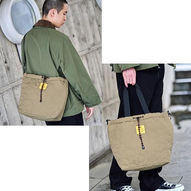【人気モデルのパデッドトートバッグ が進化!秋冬の着こなしに寄り添うトートバッグ】 ショルダーにもトートバッグにもできる2WAY仕様で、肩掛けにも対応できる絶妙な長さの持ち手や、2つのファスナー付き内ポケットなど、使いやすさにこだわった設計です。 開口部はドローコードで絞れるデザインが施されており、巾着型にフォルムチェンジも可能!気分やスタイルに合わせてアレンジできる◎ カラー展開は、落ち着きのあるアースカラーで、秋冬コーデにも自然になじみます。また、裏地には鮮やかなオレンジ色を採用し、ワークウェアを意識したデザインに。中身が見やすく、荷物が探しやすいという利便性も兼ね備えています。 シンプルな中に、さりげないこなれ感を。ニットやコートとの相性も抜群で、季節感をさりげなく演出します。 毎日のスタイルに寄り添う、デイリー使いに大活躍間違いなしのアイテムです。
