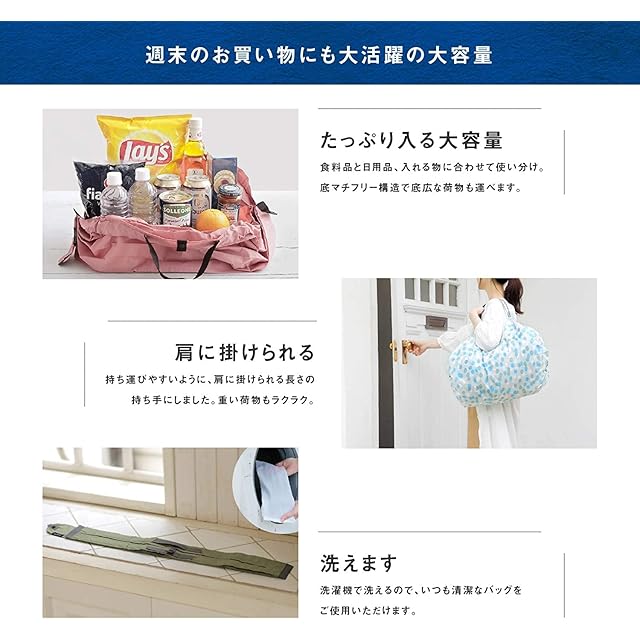 【レジカゴにかけられる大容量サイズ】1週間のまとめ買いにもおすすめのLサイズ。買い物の精算時、レジカゴにセットすれば、荷物を移し変える必要もなく、そのまま持ち帰ることが出来るので時短にも。袋口にボタンがついているので中身がこぼれにくく、持ち手が長く肩がけできて重い荷物もラクラク。
