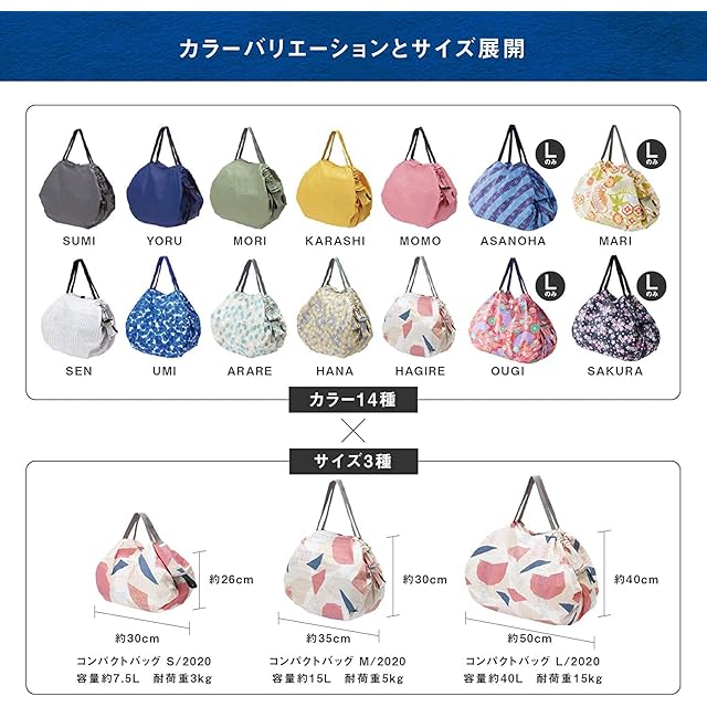 【さらにコンパクトに、もっと大容量に。】丸めた時の直径は約6.5cmで重さは約118g。Mサイズと同じ生地へ変更し、従来のLサイズより軽く、コンパクトに。また、耐荷重(約15kg)はそのままに容量は約40Lにアップし、もっとたっぷりと入れられるようになりました。