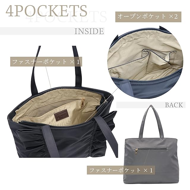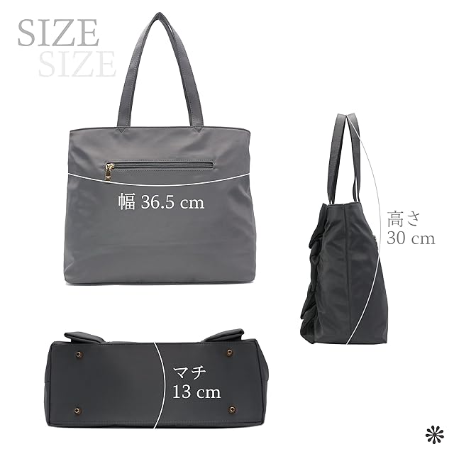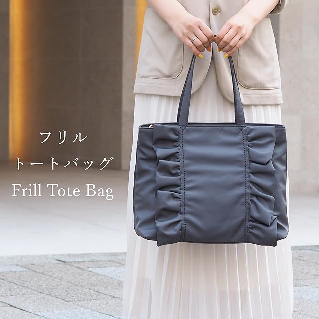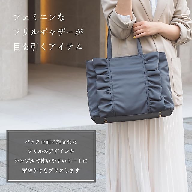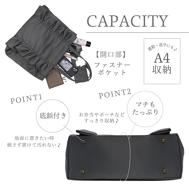 ①フリルが大人かわいいデザインのトートバッグ ②ハンドルも肩に掛けやすい長さで使い勝手の良いサイズ感! ③内側にはボトルホルダー付きで通勤通学、普段使いにと便利な仕様になっています 底鋲が付いているのもポイントです♪