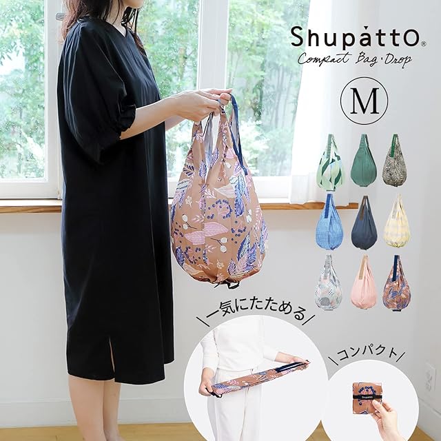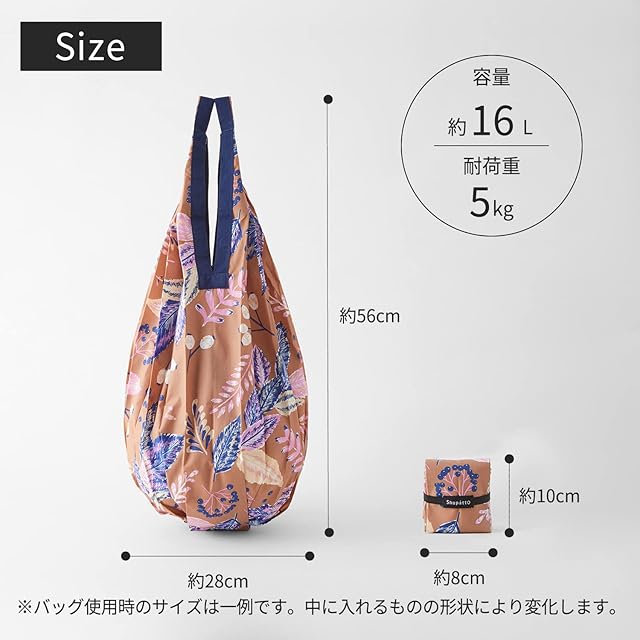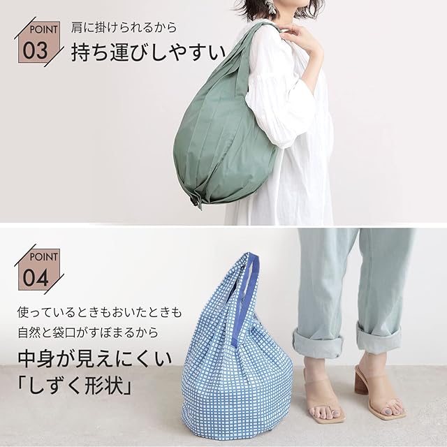 【いつもバッグに入れておけるコンパクトサイズ】レジ袋と同じような感覚で、荷物をスムーズに収納できます。底マチフリー構造のため、底面が広いケーキの箱も入れられます。使っているときも置いたときも自然と袋口がすぼまり、中身が見えにくい「しずく形状」です。ショッピングバッグ、買い物バッグはもちろん、旅行のサブバッグなどにも。コンパクトで複数持ち歩いてもスペースを取らない「いつも一緒」を目指したマイバッグです。