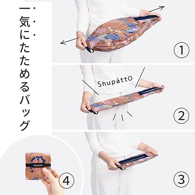 【Shupattoコンパクトバッグ】両端を“シュパッ"と引っ張って、簡単に小さくまとめられる「Shupatto」シリーズ。コンパクトに持ち運べるので、仕事帰りの買い物など、急に荷物が増えても大丈夫。
